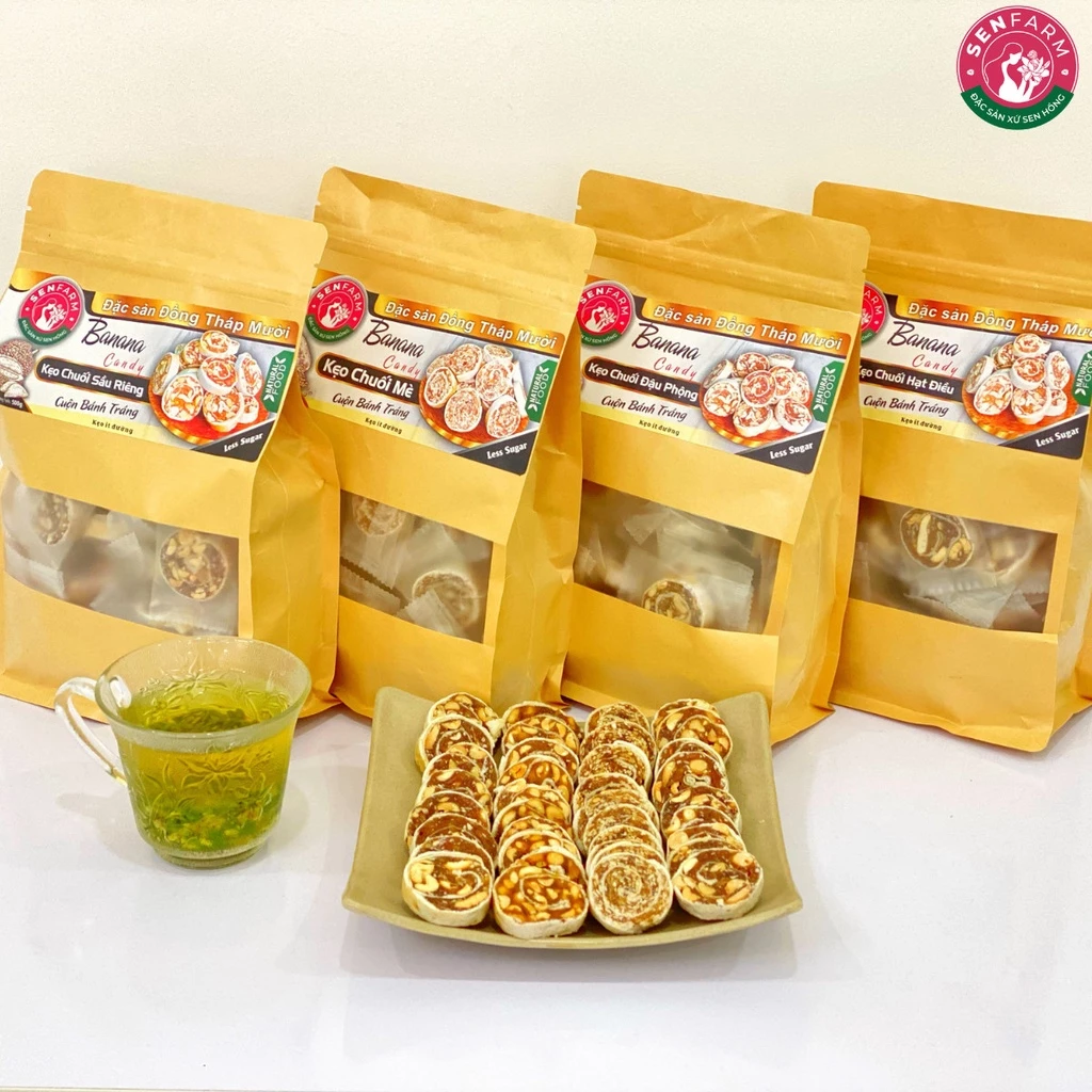 Kẹo Chuối Hạt Điều Cuộn Bánh Tráng Senfarm – Dẻo ngọt vị chuối xiêm, giòn bùi hạt điều, thơm béo mè trắng, món quà quê dân dã đậm hồn Việt.